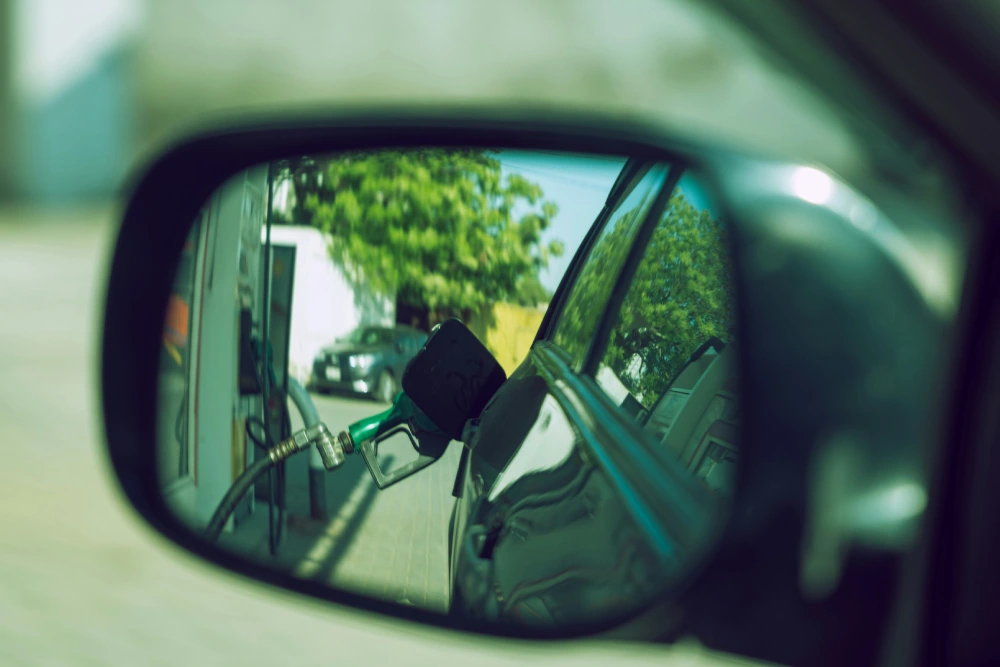 Lo specchietto laterale di un'auto riflette l'immagine di un erogatore verde inserito nel serbatoio di una stazione di servizio, evidenziando in modo sottile la crisi energetica del Portogallo, con alberi e un altro veicolo visibili sullo sfondo.