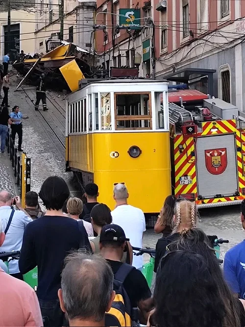 Deraglia la funicolare da Gloria a Lisbona: alcune persone guardano la scena dell'incidente.