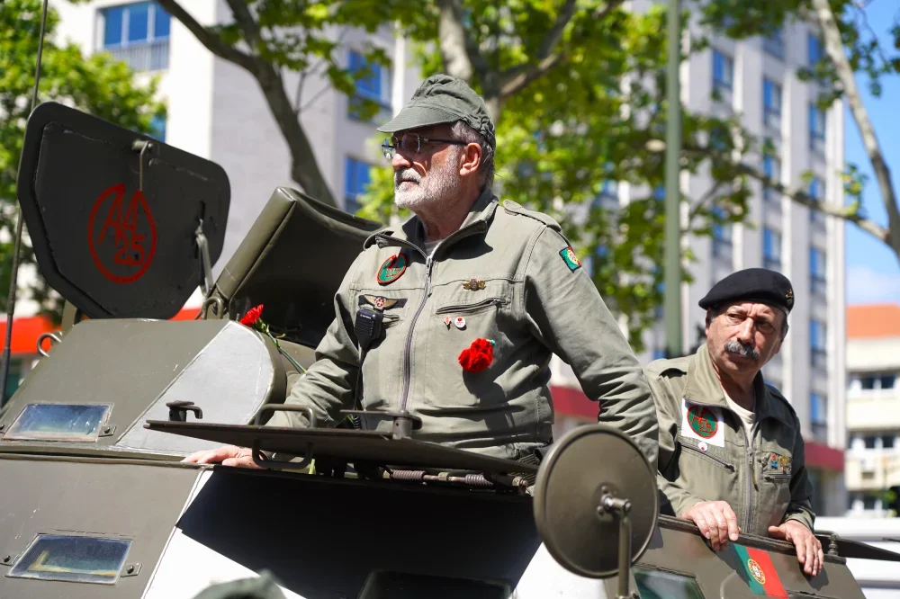 Due uomini in divisa militare sopra un cingolato durante la sfilata del 25 aprile 2025 a Lisbona i Portogallo.