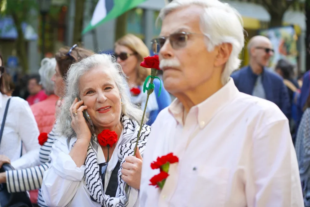 Due anziani signori eleganti partecipano alla Due ragazzi con maglietta rossa ed un garofano rosso all'orecchio durante la sfilata del 25 aprile 2025 a Lisbona in Portogallo. Hanno dei garofani rossi, mentre la donna sta telefonando.