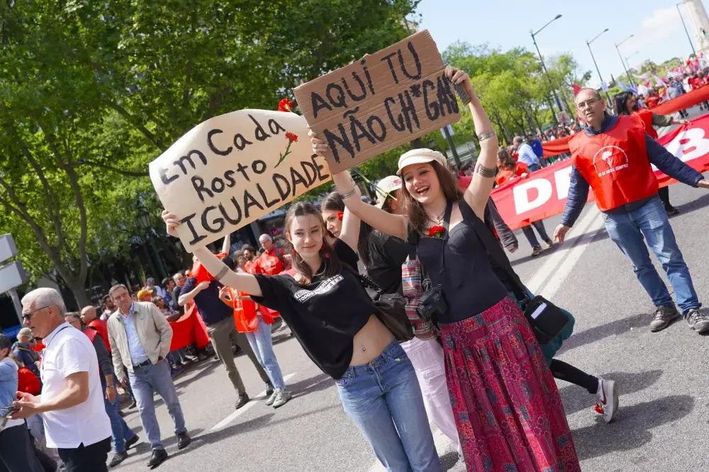Due Ragazze mostrano dei cartelli durante la sfilata del 25 aprile 2025 a Lisbona i Portogallo. Sono all'aperto nel mezzo di una strada con altri manifestanti.