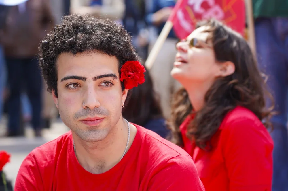 Due ragazzi con maglietta rossa ed un garofano rosso all'orecchio durante la sfilata del 25 aprile 2025 a Lisbona i Portogallo.