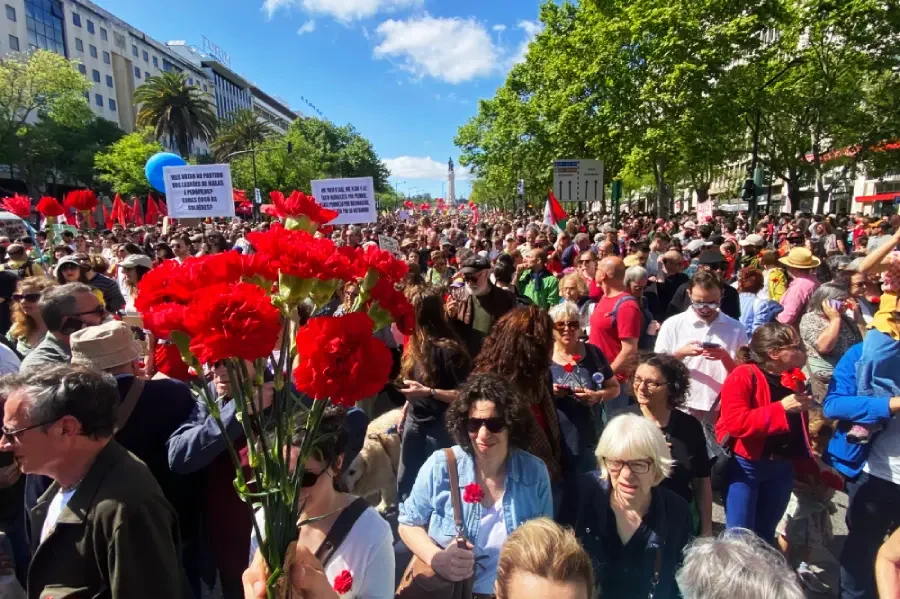 Molta gente in strada manifesta durante la sfilata del 25 aprile 2025 a Lisbona i Portogallo. In rimo piano un mazzo di garofani rossi, simbolo della rivoluzione.