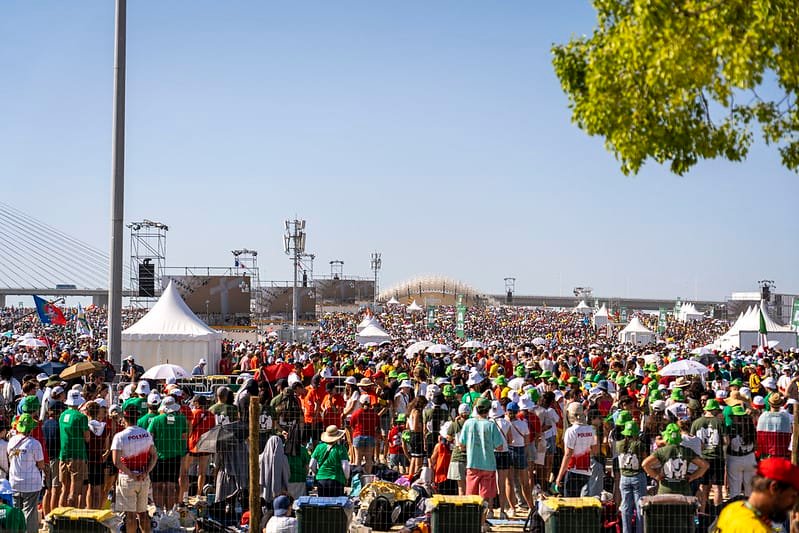 Una grande folla di persone, molte delle quali indossano cappelli e abiti colorati, si raduna all'aperto sotto un cielo limpido per la Giornata Mondiale Gioventù. Sullo sfondo sono visibili diverse tende e strutture bianche. Ci sono alberi e una recinzione in primo piano e un ponte si estende in lontananza.