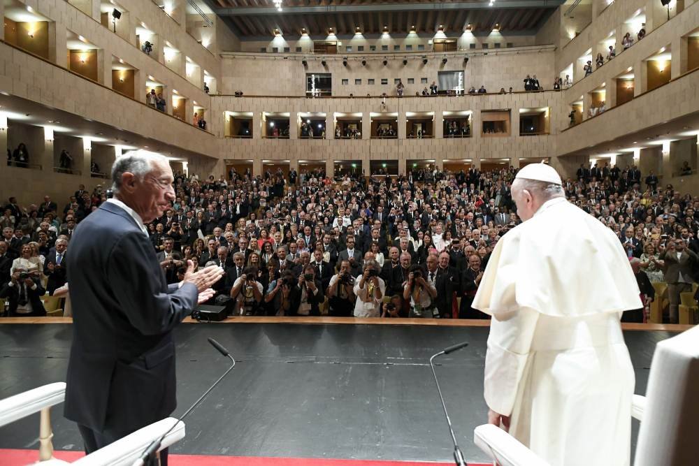 Un vasto pubblico in una sala al coperto osserva un uomo in giacca e cravatta che applaude una persona in vesti bianche sul palco durante la Giornata Mondiale Gioventù. Il locale ha più balconi a più livelli e molte persone stanno scattando fotografie.