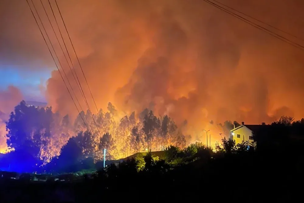 Le immagini dell'incendio nel nord del Portogallo di luglio 2025. Si vedono delle piante ardere e molto fumo.
