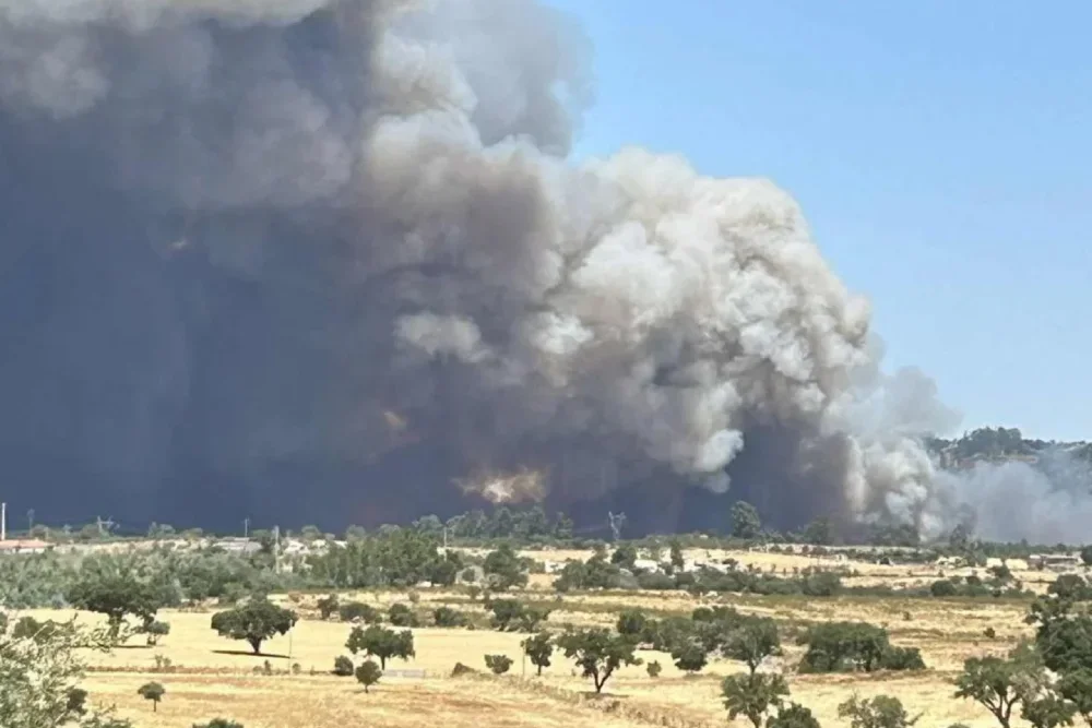 Le immagini dell'incendio nel nord del Portogallo di luglio 2025. Si vedono delle piante ardere e molto fumo.