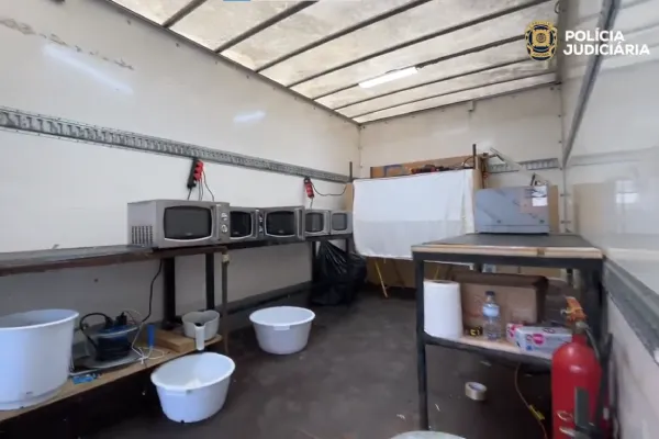 L'interno del laboratorio laboratorio di cocaina smantellato in Portogallo con microonde, ciotole di plastica e una scrivania. Il logo "Polícia Judiciária" è visibile nell'angolo in alto a destra. Vari oggetti e prese elettriche sono sparsi in tutto lo spazio.