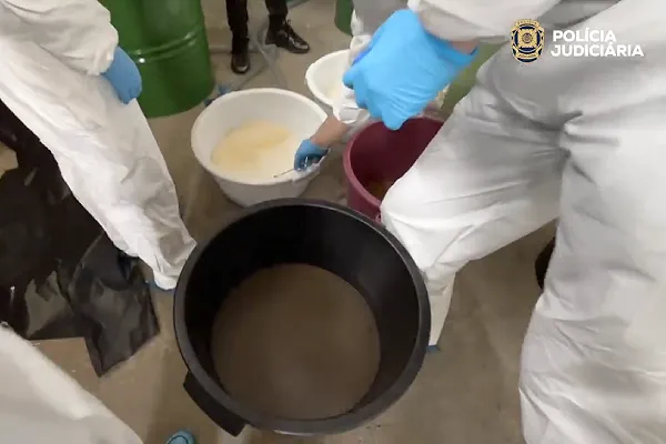 L'interno del laboratorio laboratorio di cocaina smantellato in Portogallo. Si vedono 4 secchi contenenti una polvere bianca e due poliziotti della scientifica che eseguono analisi.