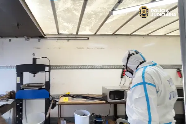 L'interno del laboratorio laboratorio di cocaina smantellato in Portogallo. Una persona con equipaggiamento protettivo è in piedi in un ambiente arrangiato. Sono presenti delle attrezzature, tra cui una macchina e un microonde. Un logo con la scritta "Polícia Judiciária" è visibile nell'angolo in alto a destra.