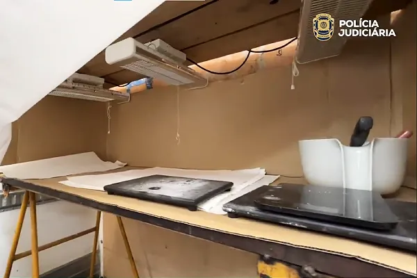 L'interno del laboratorio laboratorio di cocaina smantellato in Portogallo. Un piccolo tavolo è allestito con attrezzi sotto luci artificiali. Ci sono delle bilance sporche di cocaina sul tavolo, con un contenitore grigio contenente vari utensili. L'emblema della Polícia Judiciária è visibile nell'angolo.