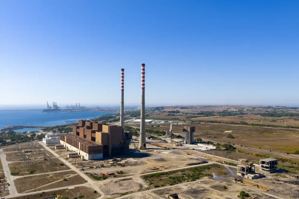 Frame del video di demolizione in veduta aerea di due alte ciminiere di una centrale elettrica, che si appoggiano e crollano tra nuvole di polvere vicino a un edificio industriale sulla costa, con un cielo azzurro e gru portuali lontane sullo sfondo.