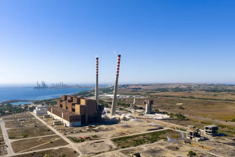 Frame del video di demolizione in veduta aerea di due alte ciminiere di una centrale elettrica, che si appoggiano e crollano tra nuvole di polvere vicino a un edificio industriale sulla costa, con un cielo azzurro e gru portuali lontane sullo sfondo.