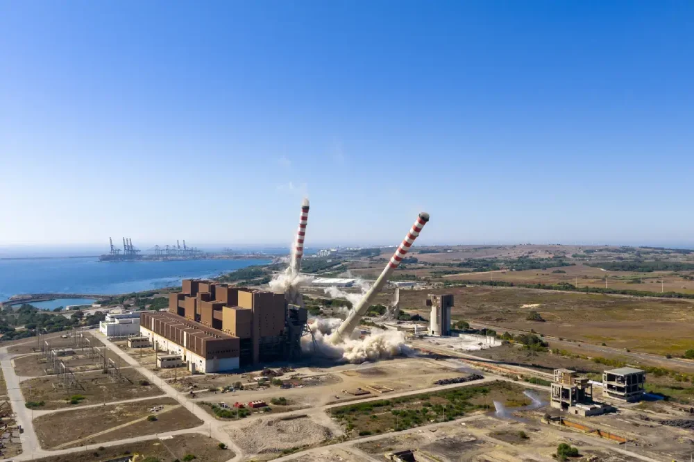 Frame del video di demolizione in veduta aerea di due alte ciminiere di una centrale elettrica, che si appoggiano e crollano tra nuvole di polvere vicino a un edificio industriale sulla costa, con un cielo azzurro e gru portuali lontane sullo sfondo.