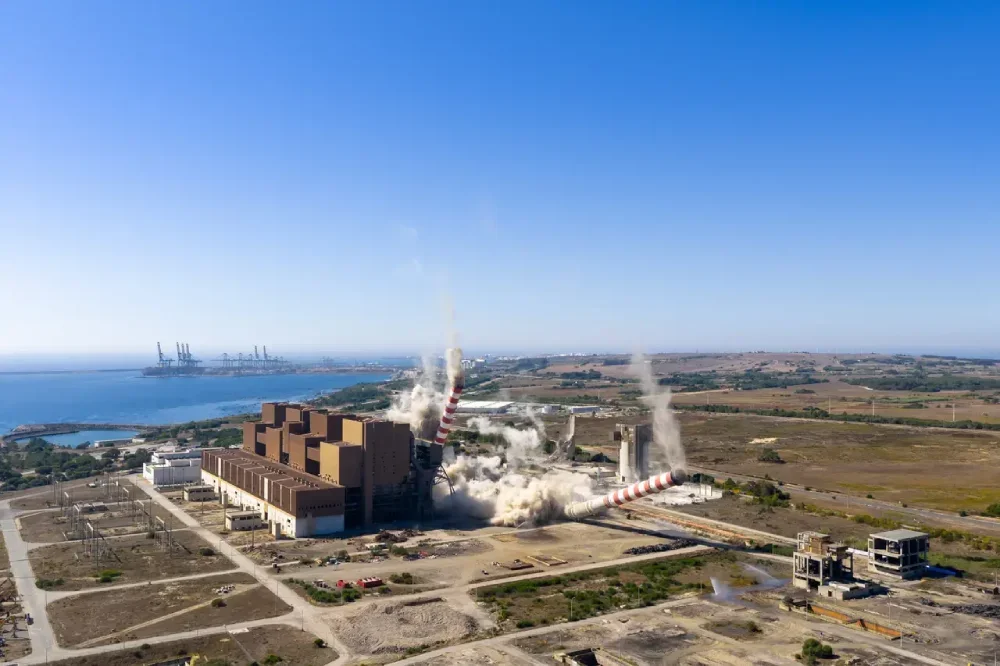 Frame del video di demolizione in veduta aerea di due alte ciminiere di una centrale elettrica, che si appoggiano e crollano tra nuvole di polvere vicino a un edificio industriale sulla costa, con un cielo azzurro e gru portuali lontane sullo sfondo.