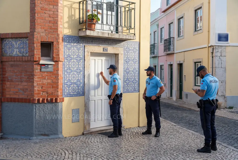 Immagine generata con tre poliziotti in una via a Lisbona mentre bussano alla porta di un affittacamere per verificarne la regolarità ed evitare una truffa.