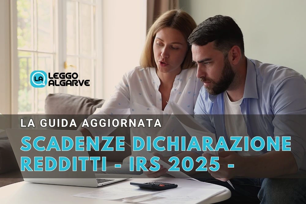Una donna e un uomo sono seduti a un tavolo, mentre esaminano le scadenze dei documenti da dichiarare in IRS in Portogallo con un computer portatile davanti a loro. La sovrapposizione di testo in italiano annuncia SCADENZE IRS PORTOGALLO - DICHIARAZIONE REDDITI 2025, insieme al logo "LEGGO ALGARVE.